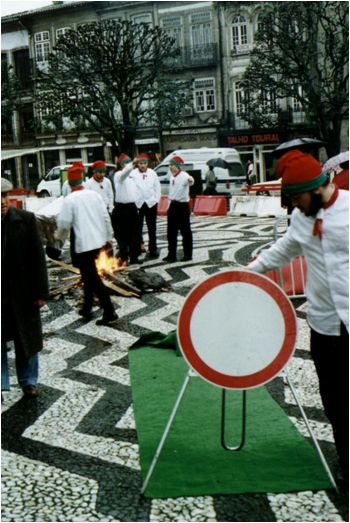 Foto:http://araduca.blogspot.com/ Um dos números menos consensuais do programa das Festas Nicolinas é o das Roubalheiras, que consiste no furto de tabuletas, vasos de flores e outros objectos que se encontravam mais à mão de semear. Os objectos retirados pelos estudantes dos lugares respectivos eram levados para o Toural, onde ficavam a adornar o pinheiro. Este acto acontecia na mesma noite das posses (4 de Dezembro) e realizou-se, pela primeira vez, aquando da restauração das Nicolinas em 1895. Nesse ano, o jornal "Religião e Pátria" noticia umas inofensivas brincadeiras de rapto de tabuletas, vasos, mesas, etc. que na manhã de 5 se viam fazendo bric-a-brac em volta do pinheiro. Nos seus primórdios, esta tradição era conhecida pelo título sugestivo de rapto das tabuletas, por serem os letreiros que se encontravam às portas das lojas, dos serviços e dos profissionais liberais as principais vítimas dos furtos. Mas também não faltavam os bichos de capoeira. A designação roubalheiras é quase tão antiga como aquela, embora menos generalizada nos seus primeiros anos. A roubalheira resulta da adaptação em meio urbano de uma antiga tradição do mundo rural minhoto, levada à prática por altura das festas dos santos ditos populares, em especial durante os festejos a S. Pedro, também conhecido em terras próximas da cidade de Guimarães como o dia dos atrancamentos. Por essas aldeias afora, era costume aparecerem, na manhã do dia 29 de Junho, caminhos atrancados com alfaias agrícolas, vasos, utensílios e animais domésticos, desviados dos seus lugares habituais por bandos de rapazes. Havia quem não apreciasse esta brincadeira dos estudantes. No jornal Independente, de 7 de Dezembro de 1902, defende-se que os estudantes "não deviam, com o roubo das tabuletas, desrespeitar a liberdade alheia, quando com tão severas penas pretendem conservar a própria liberdade". Não faltaram, ao longo dos tempos, suspensões e proibições desta prática. "Nós discordamos apenas das roubalheiras. Isto não está nas tradições dos festejos nicolinos e, ainda que estivesse, era um número que se devia banir, porque ofende muitas vezes e raro tem graça..., " escrevia-se no "Regenerador", de 10 de Dezembro de 1909. As censuras às roubalheiras (e também às posses) eram quase generalizadas. Até o primeiro responsável pelo ressurgimento de 1895, Jerónimo Sampaio, escrevia no "O Comércio de Guimarães", de 11 de Dezembro de 1923: Fonte:http://araduca.blogspot.com/