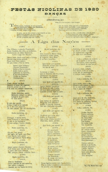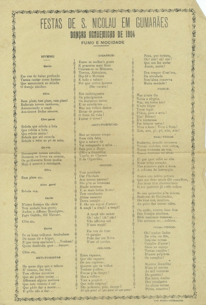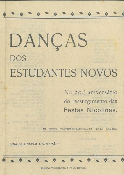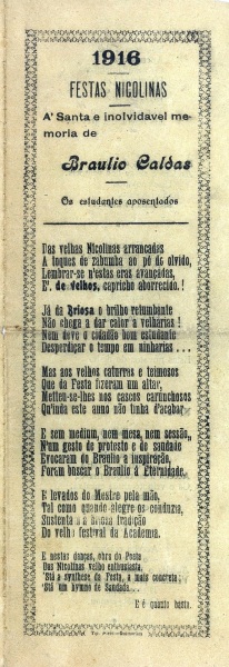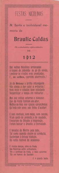 Das velhas Nicolinas arrancadasA toques de zabumba ao pó do olvido,Lembrar-se nestas eras avançadas,É, de velhos, capricho aborrecido.!Já da Briosa o brilho retumbanteNão chega a dar calor a velharias!Nem deve o cidadão bom estudanteDesperdiçar o tempo em ninharias…Mas aos velhos caturras e teimososQue da Festa fizeram um altar,Meteu-se-Ihes nos cascos carunchososQu'inda este ano não tinha d'acabar!E sem medium, nem mesa, nem sessão,Num gesto de protesto e de saudade,Evocaram do Bráulio a inspiração,Foram buscar o Bráulio à Eternidade.E levados do Mestre pela mão,Tal como quando alegre os conduzia,Sustentam a briosa tradição,O velho festival da Academia.E nestas danças, obra do PoetaDas Nicolinas velho entusiasta,Esta a síntese da Festa, a mais concreta:Está um hino de Saudade…