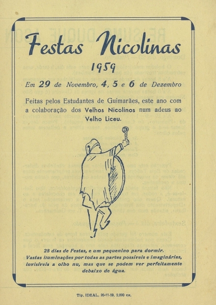 Por isso, dispensar-me-ei de testemunhar factos passados noutros tempos, para me remeter unicamente a um pequeno historial da minha vivência nicolina na década de 60, aquela em que frequentei o Liceu de Guimarães, tendo participado mais ou menos ativamente nos festejos dos estudantes da academia Vimaranense em honra do Santo Nicolau.