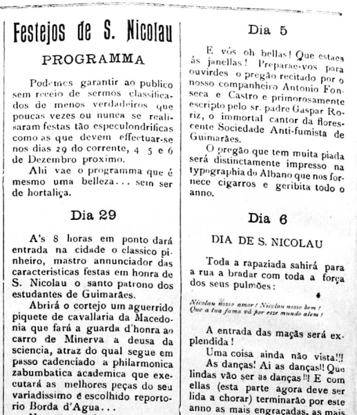 Pede-se aos snrs. João de Melo e José de Freitas, com estabelecimentos no Toural e Porta da Vila, o favor de pôr os olhos neste programa que talvez possa servir de modelo para o das próximas festas Gualterianas. Terminando, aí vão os três vivas do estilo: Vivam as festas de S. Nicolau! Viva a cidade de Guimarães! Viva quem é amigo da rapaziada!