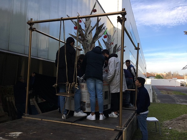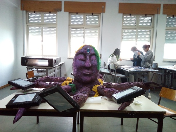 Os objetivos da atividade: 1. Perceber a importância da investigação numa criação original; desenvolver um projeto como antevisão de uma construção; executar a construção de um projeto. Começamos por estudar a temática no contexto da religião e o seu reflexo numa lenda popular, descodificando os seus elementos e personagens aglutinadores de uma história: a árvore, a maçã, o "Eden" (paraíso), o Adão e a Eva. Na construção de um ambiente cénico/teatral os elementos são tratados de forma ilustrativa dos ambientes e os personagens decorados conforme o enredo de uma ficção. A atividade decorreu com o sucesso limitado à qualidade dos meios e os alunos envolveram-se de forma satisfatória.  Foram usados esferovite, cola, jornais, garrafas de plástico, ferro, tintas, leds e ferragens.