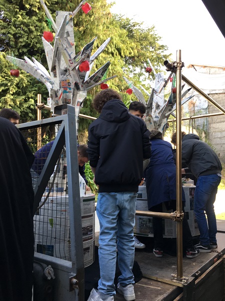 Foram usados esferovite, cola, jornais, garrafas de plástico, ferro, cartão, tintas e ferragens, material reciclado quase na totalidade.