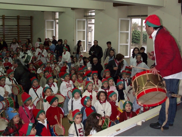 As crianças deliram com a sua presença. Também estas crianças, com afinco e dedicação, pegam nas suas baquetas e num ritmo perfeito sai o toque do pinheiro: 3. 2. 2. 3. 1. 3. 3. 5 e volta tudo ao início, ao repique da caixa.