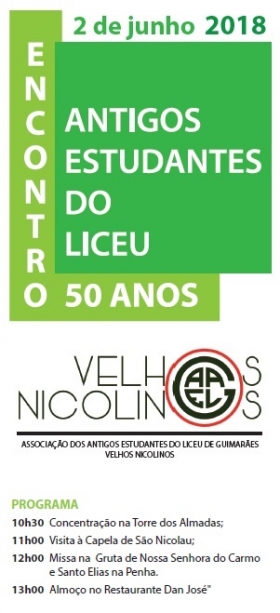 Lembramos que termina já no próximo dia 1 de Junho as inscrições para o almoço do tradicional "Encontro dos 50 anos – edição 2018" que decorrerá no dia 2 de Junho (primeiro Sábado do mês), com programa atempadamente divulgado, destinado a todos os velhos companheiros cuja primeira matrícula no antigo Liceu Nacional de Guimarães ocorreu há 50 anos ou mais (este ano reforçado com os matriculados no ano 1966/67).