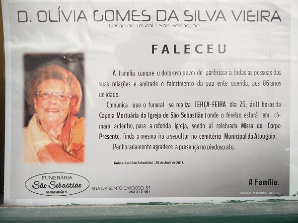 Comunicamos com pesar o falecimento de D.Olívia Vieira, da Pastelaria Clarinha, sogra de José Ribeiro, presidente da AAELG Velhos Nicolinos.