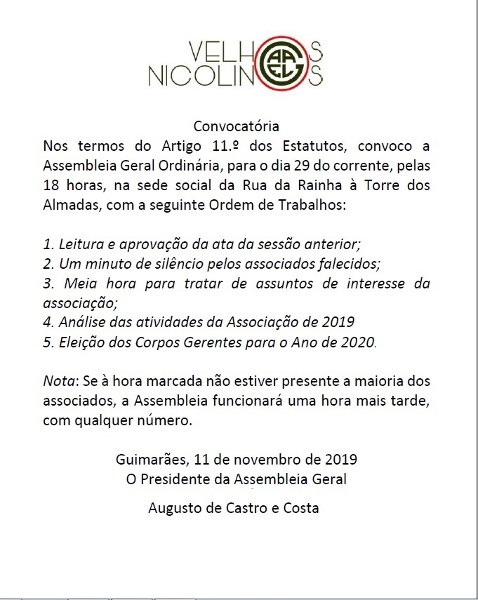 Nos termos do Artigo 11.º dos Estatutos, convoco a Assembleia Geral Ordinária, para o dia 29 do corrente, pelas 18 horas, na sede social da Rua da Rainha à Torre dos Almadas.