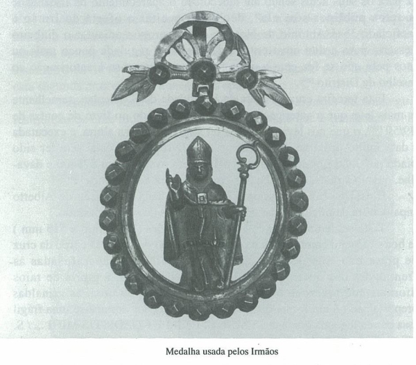 Voltemos novamente às medalhas distintivas dos Irmãos, que estes ostentavam quando saíam em Irmandade. Inicialmente, eram de uso pelos Irmãos oficiais da Mesa(111), e, portanto, em número reduzido: oito medalhas de prata inventariadas em 1732(112), o mesmo número confirmado em 1822. Não se sabe como escaparam às exigências de Junot, se por estarem na posse dos diferentes mesários, se por serem fáceis de escamotear. Vimos depois como a 26 de Abril de 1822, foi deliberado mandar fazer vinte e quatro medalhas de prata da melhor, "uniformes", para que "deste modo se promova visivelmente o esplendor e zelo devido com uma módica despesa". Sabemos que acabaram por ser feitas vinte e cinco medalhas, conhecemos as verbas que com elas foram gastas em 1822/23, sabemos mesmo que, das antigas, três escaparam ao cadinho. Passaram a ser, portanto, em número de vinte e oito (116). Algumas décadas depois esse número era insuficiente e "muitas vezes deixam de acompanhar os mesmos irmãos as procissões por falta delias". Em Dezembro de 1861 foi decidido mandar proceder à reforma das fitas das medalhas que disso precisassem, e encomendar mais vinte medalhas de prata, passando a haver um total de quarente e oito). Dessas quarenta e oito subsistem quarenta e sete, confiadas agora à guarda do Museu de Alberto Sampaio: quarenta e quatro são quase iguais, duas de outro modelo, uma terceira diferente das anteriores, sendo estas últimas, presumivelmente, as mais antigas. São de forma circular ou ligeiramente oval, vasadas, tendo ao centro, recortada, a imagem de S. Nicolau, barbudo, revestido de capa, mitra e báculo, com a mão direita erguida em gesto de abençoar. As quarenta e quatro estão suspensas de uma laça e apresentam no aro exterior vinte e seis contas facetadas, diferindo as restantes no modo de suspensão e no aro. Nenhuma tem aposta qualquer marca.